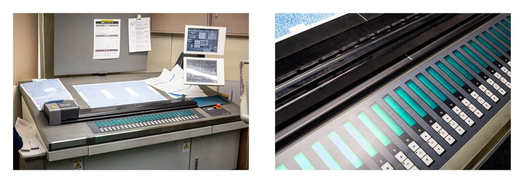 インキ自体も温度変化に弱く、夏場は硬めのインキ、冬場は柔らかめのインキを使い分ける必要があり、さらには機材のローラー自体もゴムであるため、太くあるいは細くなることで、季節の変わり目には濃度ズレ・ムラが起こりやすくなります。