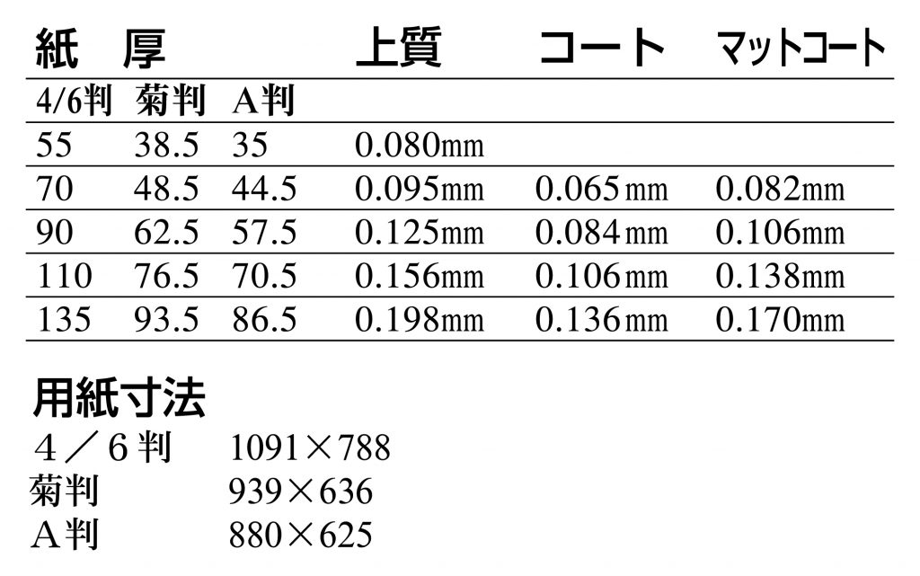 刷り本の計数も重要な作業です。一つの製品の包装が1,000枚入りなら1,000枚ちょうどに数えなければなりません。そこで活躍してくれるのが計数器(図3)です。稀に実数より多く数えることはありますが少なく数えることはありません。この計数機に紙を積みます。紙はその紙質、斤量(紙の重さ)によって厚さが違うので、図4の数値を参考にすればその高さでおおよその数量が解かります。例えば4/6判の上質紙55kgなら8cmで約1000枚になります。図4以外の用紙の場合はマイクロメーター等で厚さを測定します。必要枚数よりやや多めに積んで計数します。