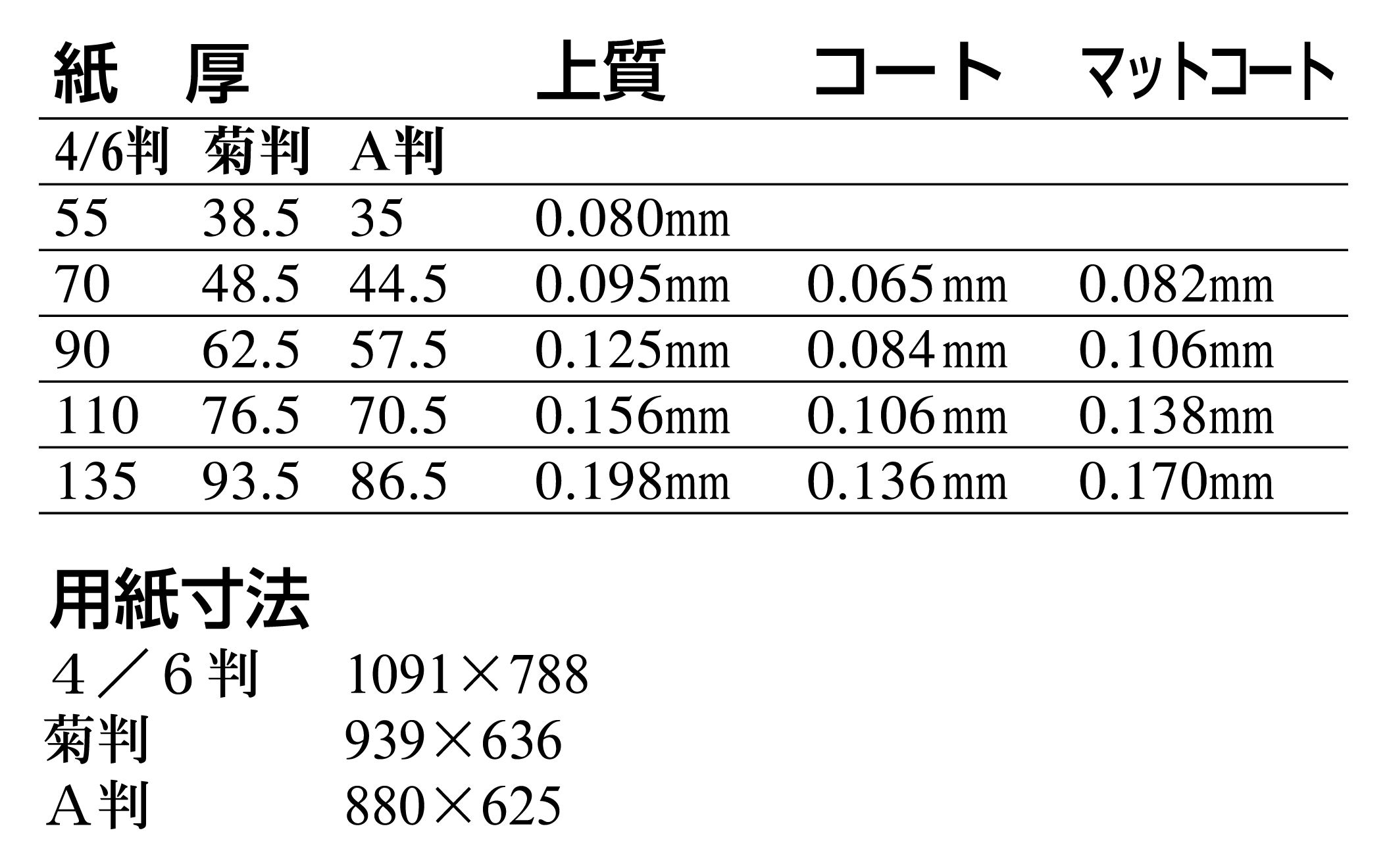 刷り本の計数も重要な作業です。一つの製品の包装が1,000枚入りなら1,000枚ちょうどに数えなければなりません。そこで活躍してくれるのが計数器(図3)です。稀に実数より多く数えることはありますが少なく数えることはありません。この計数機に紙を積みます。紙はその紙質、斤量(紙の重さ)によって厚さが違うので、図4の数値を参考にすればその高さでおおよその数量が解かります。例えば4/6判の上質紙55kgなら8cmで約1000枚になります。図4以外の用紙の場合はマイクロメーター等で厚さを測定します。必要枚数よりやや多めに積んで計数します。