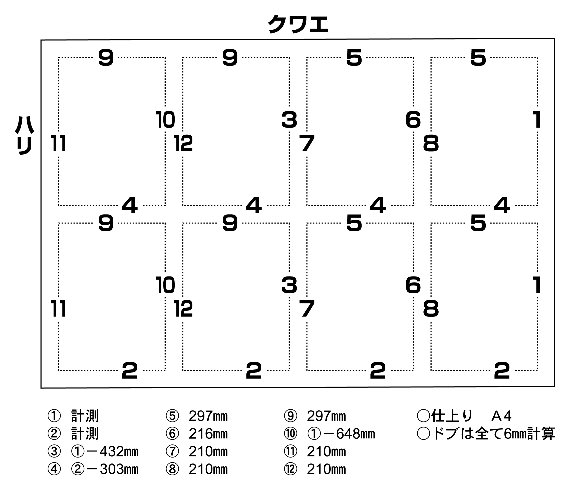 続いて見当合わせをします。断裁する刷り本の四方トンボに線を引き、刷り本のクワエ側と横針側(印刷するときの寸法の起点になるものです)を基準にし、これに断裁機の刃を合わせて計測します。この数字を元に断裁の寸法と順序を決めます。図2はその一例です。また紙が伸び縮みして寸法が狂ったり、トンボが正確な寸法通りではないこともあるので注意が必要な結構微妙な作業です。中にはコンマ何ミリずれただけでもずれが目立ってしまう絵柄もあるので、製品の品質を決める重要な作業になります。