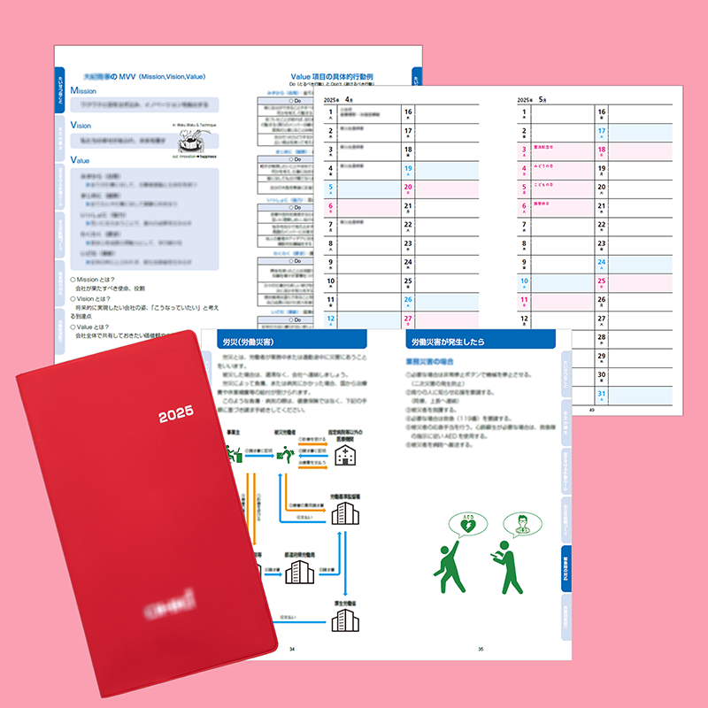 再版となる今年度版では、社員手帳のように「経営計画やスケジュール表を追加したい」との要望をいただき、書き込むことを考慮して2つのサイズをご提案。文字サイズの比較も含めてサンプルを作成し、その結果「見やすさ」と「書きやすさ」を評価され、初版よりも大きいバイブル判サイズでの制作となりました。安全手帳と社員手帳の機能が1冊で完結し、現場でご活用いただいております。